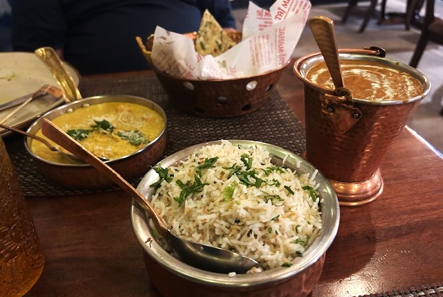 The food was pretty good though and we went home with leftovers. We started with an appetizer of vegetable pakoras, our main-courses were Dahl Makhani and a Coconut Chicken with a shared coconut rice. Drinks were a delicious mango lassi for me and a coconut one for Norm.