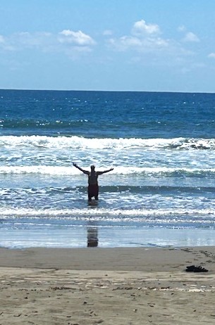 We decided to go to nearby Playa Linda for a little beach time. But first we stopped off to buy a loaf of banana bread. There at the beach we had our snack and Norm a short nap. We tested the ocean water … so warm and lovely! But oh the waves were strong! Norm went in but I preferred the safety of the pool when we return.