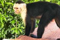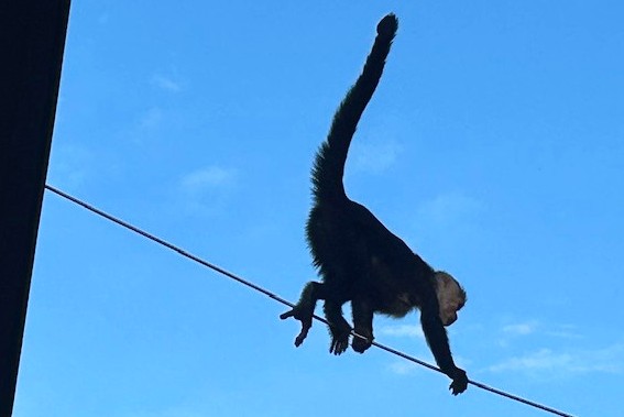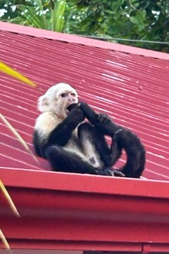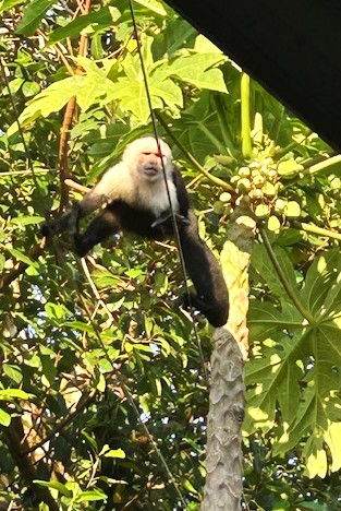 The day passed by ever so fast, with hammock time and a long leisurely swim in the pool. How could the time evaporate so quickly? The mischievous Capuchin monkeys were early to visit and stayed an unusually long time! We watched them swing from the banana trees, back and forth grabbing a green banana when they could. But there was not enough for the whole troop. So flowers were devoured. Soon they were everywhere jumping on the roofs, balancing on the wires and scampering across rails and balconies. What a show!