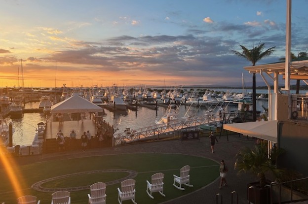 There are ritzy yachts and more ritzy yachts moored there. First we joined many others in watching the sunset. There were even large chairs around the property to sit on. Norm found his own chair in the perfect sunset location. The sunset was spectacular!