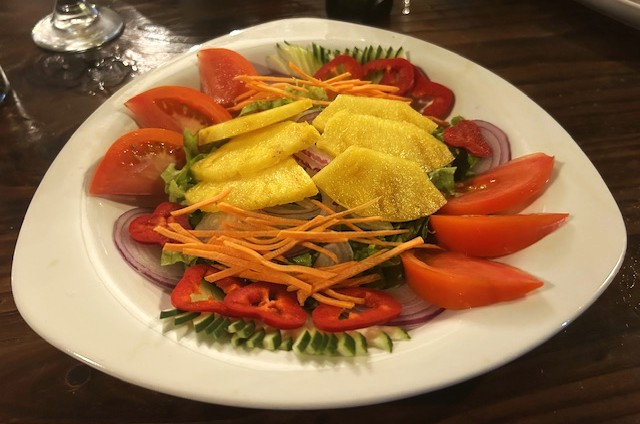 I enjoyed a terrific colourful salad of greens, carrots, tomatoes and pineapple … if only it had a tropical salad dressing, the olive oil just didn’t cut it! Norm enjoyed his shrimp ceviche and chicken wings. The homemade plantain chips were delicious with an included dip. Best of all it was happy hour all day! Two margaritas for the price of one!