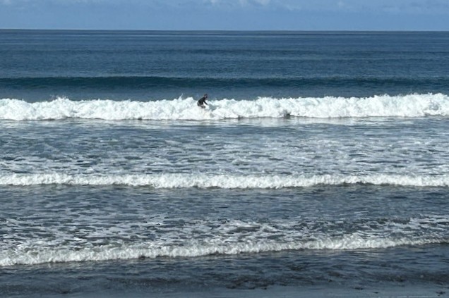 Yesterday 12 February, the pounding surf looked strong from up here with a bird’s eye view of the coastline at Pacific Edge. The English surfing family headed out early. Another couple from Massachusetts went whale watching. The couple beside us in Cabin #1 are prospecting the property as possible co-owners. That leaves just us for breakfast. Isobel, Lori-Anne’s daughter, made us a thick piece of French Toast smothered in fresh pineapple with real maple syrup! Scrambled eggs on the side and more fresh fruit too. Delicious!