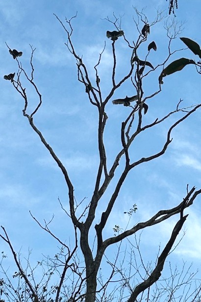 No Howler monkey sounds to wake me up only the sound of the Crested Guan so early. Just as dawn is breaking I climb the cicada graveyard stairs … there are 10 awaiting. I hope they had a good life. The Acacia tree outside our unit fills with birds in the morning. It is a lot of fun seeing the little ones come and go.