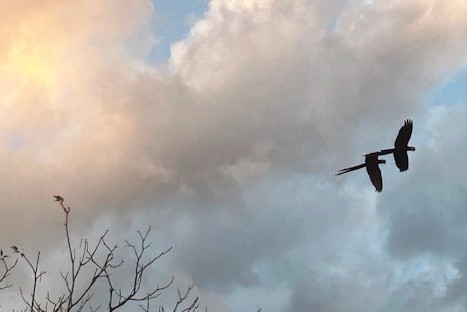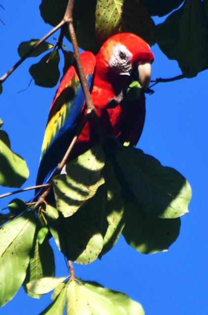 All we could find were large green parrots squabbling. I say to Norm, “Listen, I think I hear a monkey”. A few minutes later we are still looking for those Macaws, while admiring the large parrots, when from a distance we can see Capuchins with their aerial aerobics jumping from tree to tree. We follow the tree line from the road happily watching their antics when a pair of Macaws fly by, and then another pair. They all fly into a nearby tree.