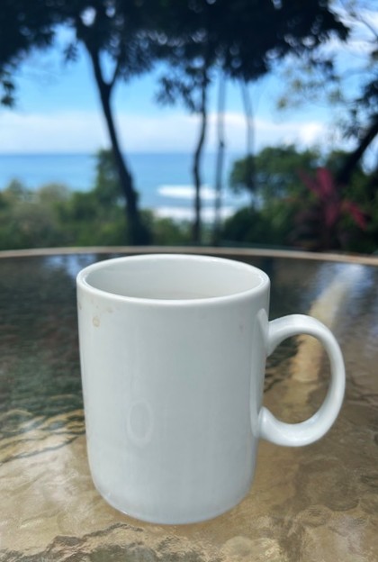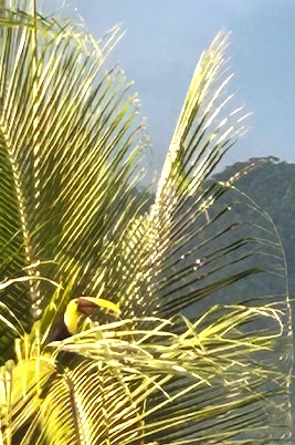 Norm surprised me this morning with a cup of coffee … another much appreciated ‘gift’. These thoughtful ‘gifts’ don’t cost anything but are so appreciated! The macaws chatter on and on until I’m just about to go look for them. Now all is silent. They have moved on. I go for my short walk anyways. I’m surprised how big the Villas Rio Mar property is. I spot a coati at the edge of the property and a huge vulture perched on a stump like a lawn ornament. There is a 800 m trail that looks inviting but I’m in flip flops and I remind myself it’s not safe. Just as I’m headed back I see a toucan fly into a tall tree! What a morning!