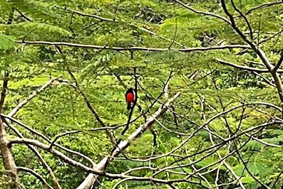 It was a breakfast buffet today with homemade tortillas, fresh fruit, squeaky cheese, scrambled eggs, rice and beans. And delicious coffee. We arrived a little early to find a pair of Scarlet Macaws in a nearby tree. While we were eating breakfast, they were eating theirs. The only thing that seems to keep them quiet! We talk to various guests while waiting for our ‘included walk’. Mario, our nature guide, takes us to the suspension bridge and frog ponds. Norm was almost ready to turn around but Mario said I have a bench for you! There we sat and watched nature come to us.