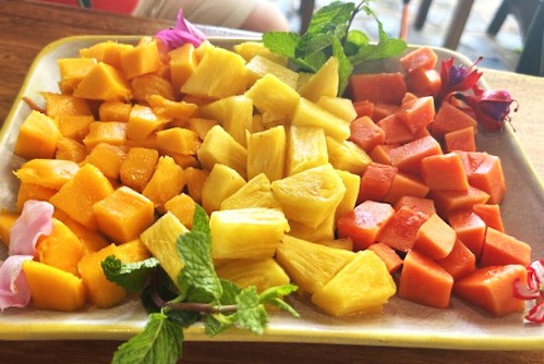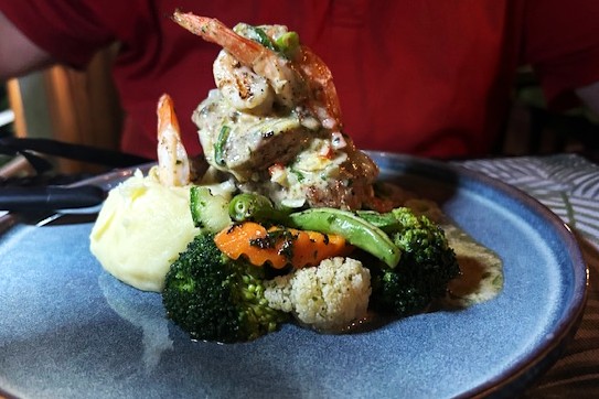Heliconia is a popular restaurant just off the highway but yet with a ‘being in the jungle’ kind of feel. I started with a Margarita on the strong side that once Norm tried it he wanted one too. For my meal I started with a small plate of tortilla chips with guacamole and a small amount of refried beans. My main course was a strawberry goat cheese salad. Norm had coconut shrimp to start and a pork shrimp ‘tower’ for his main course. Everything fresh and delicious!