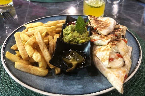 We drive back to our local restaurant choice, Costanera House 186, a local spot just off the highway. Unfortunately there is absolutely nothing on the menu for me. But when I explain, I am given three choices. I chose a quesadilla option expecting the food to be very plain. But when it came out it was a full plate and the quesadilla was stuffed with veggies and cheese, with a side of guacamole and French fries. Norm said his Ceviche was top notch, the best as he can remember. And the tropical chicken curry very delicious as well. And he had to take half it home ... that almost never happens!