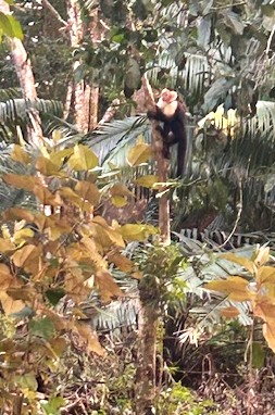 We decided to watch sunset here as this is our last night. But just before there is a commotion in the palm trees by our room. First the colourful Fiery-billed Aracari shows up, followed soon after by a raucous pair of Yellow-throated Toucans entertaining us with their antics. And just then something thumped on our roof and jumped into a nearby tall tree. A Mom carrying a Baby Capuchin! It was so hard to know where to look with so much going on!