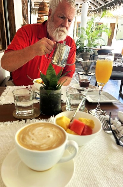 Soon we will go for breakfast. A delicious omelette stuffed with cheese and tomato awaits! Norm chooses the new stainless steel method of drip coffee a version of traditional method in Costa Rica. He wasn’t particularly impressed as he found the coffee weak. I would agree. My latte was wonderful!