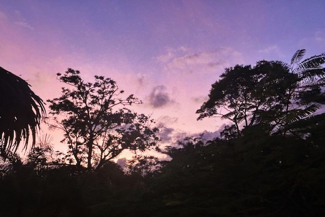 The afternoon just flew by with hammock time and watching the Yellow throated Toucans flitting from tree to tree. Sunset is early here, about 5:45 pm so we headed up to the viewing platform and eventually the mirador. So beautiful! We admired the Crested Guans flying into a nearby tree with few leaves. And two small toucans in another but by this time the light was dim.