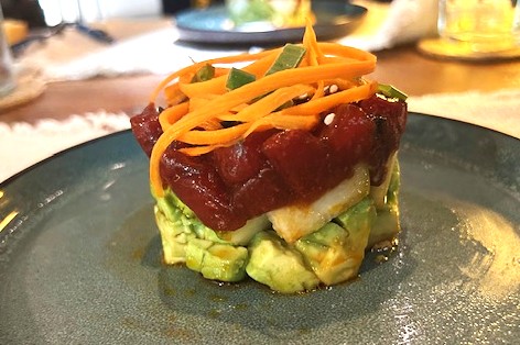 We are the first of three tables to arrive for dinner. The chef has adapted the menu to provide me with a vegetarian version. We start with an appetizer of tuna, avocado and pear. Only instead of tuna the chef baked cubes of watermelon soaked in soy sauce to make a ‘fake’ tuna appearance and taste. Rafael wanted me to guess what it was, but I certainly never thought it was watermelon! That was fun! The main course was creamy mushroom fettuccine for me and shrimp fettuccine for Norm. The sauce was a non dairy vegan version for better digestion. I would agree! All was tasty! For dessert there was coconut flan with caramel. A perfect portion dessert … not too big! Although we ordered a bottle of wine to have with dinner I also ordered a fresh strawberry Mojito, and wow was it good! First guests to arrive for dinner and the last guests to leave.