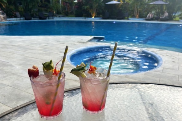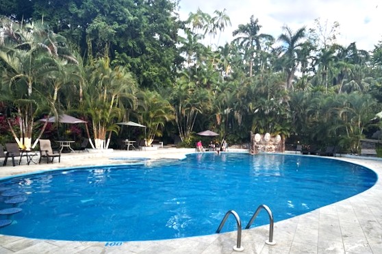 We walk to our room nearby. Very nice! Quickly we leave for Happy Hour at the pool. A delicious Guaro Sour. Guaro is a liquor made in many places in Latin America. A clear liquid distilled from sugar cane juices, it has a slightly sweeter taste than comparable liquors. Norm took a quick dip in the very large pool. Such a great pool temperature!