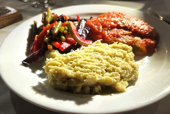 Norm is uncertain about staying for dinner but I talk him into it. Seemed like the perfect time not to go out. The parking area is narrow and requires great care if someone is parked in the handicap spot which they were when we arrived.