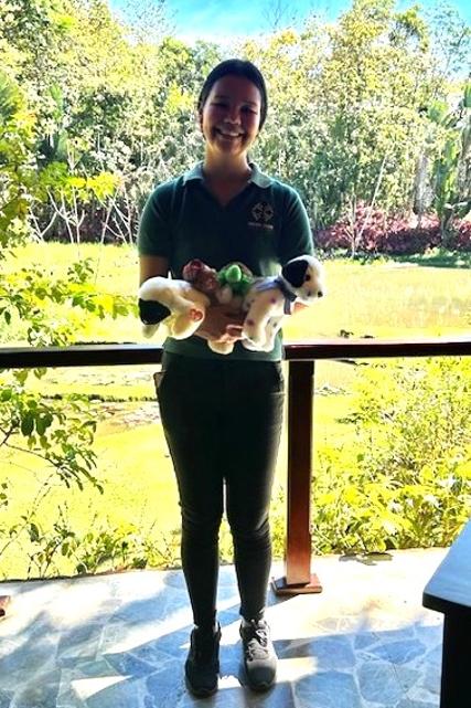 We headed down the hill to the lodge for our:8:30 am breakfast. Chocolate crepes, choice of eggs, toast and jam was this morning’s breakfast selection. Breakfast with the hummingbirds sipping sweet nectar from the surrounding flowers. We watched the different little birds dip and glide over the large pond that the lodge overlooks. A bird of prey over watched all the activity. We were in no hurry to leave and Rachel our young server shared a little info about her life, her travels and the lodge. She returns home from San Jose every weekend to spell off the staff from duties. During the week she is an engineering student herself. So friendly and sweet!