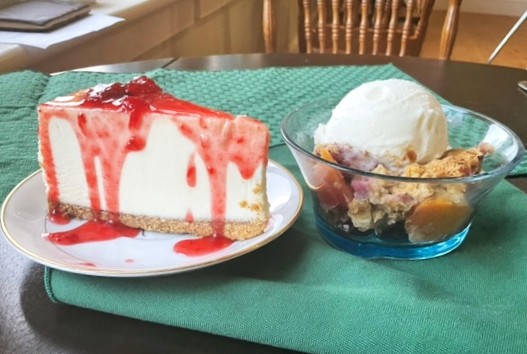 For dinner we decided to eat at the lodge. The meal plan includes dinner and breakfast the next morning for $45 plus tax/tip/beverage. Our table overlooked a garden where we watched the hummingbirds dining, sipping the sweet nectar of the nearby phlox. For me I had an appetizer of spinach dip and naan bread, Norm had seafood chowder. Main courses were broccoli salad, smashed potatoes and a stuffed Portobello mushroom for me, and for Norm … Beef Bourginnon, Caesar salad and smashed potatoes. Dessert was strawberry NY cheesecake and berry crisp. So very filling!